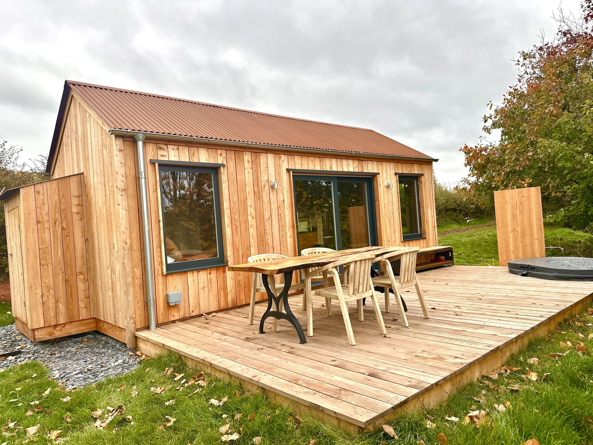 Step onto your deck and unwind in the sunken wood fired hot tub, perfectly positioned to catch sunset views over the rolling countryside.